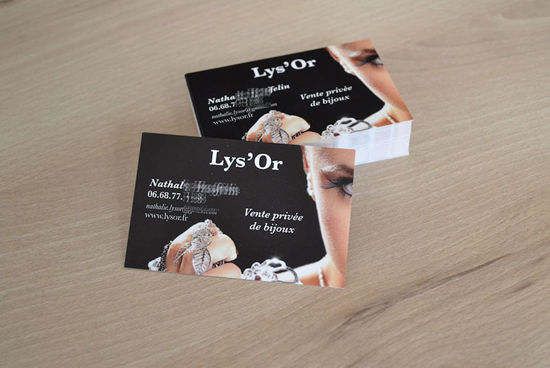 Une carte de visite idéale pour bijouterie, Vente Bijou , de couleur sombre et femme parée de bijoux